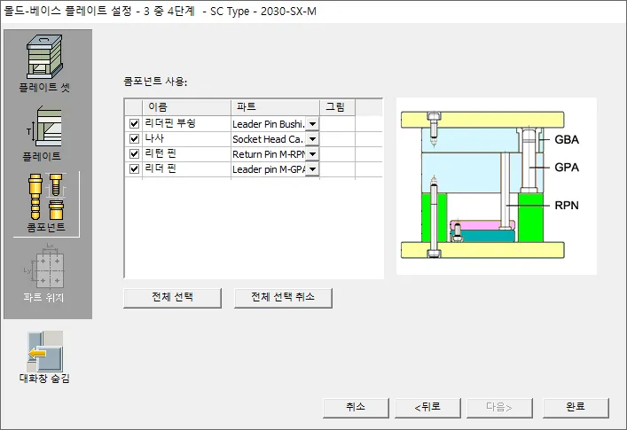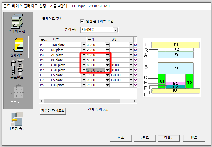 이렇게 해서 카탈로그를 이용해서 몰드베이스 2단금형과 3단금형을 만들어보았습니다. 다른 타입도 해보시면 쉽게 하실수가 있을겁니다. 이것저것 시도하다보면 데이터가 쌓여서 다음에 할때는 매우 쉽고 빠르게 작업이 가능합니다. 저희 업체는 소형금형을 주로 하다보니 SC 타입과 FC 타입 말고는 작업할일이 없네요. 암튼 도움이 되었으면 합니다.