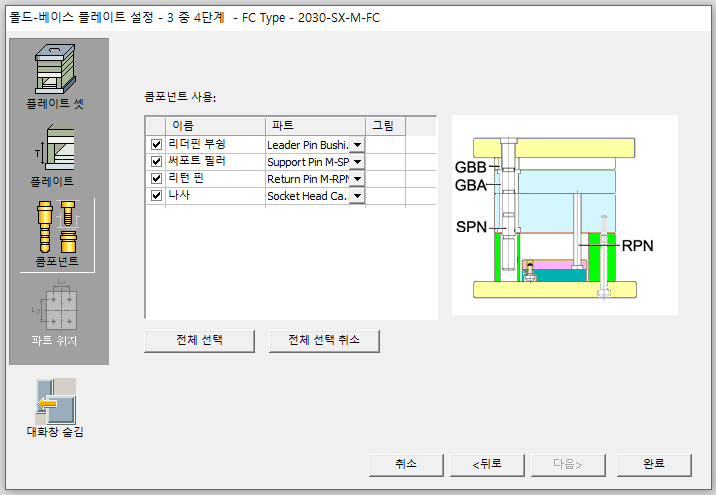 이렇게 해서 카탈로그를 이용해서 몰드베이스 2단금형과 3단금형을 만들어보았습니다. 다른 타입도 해보시면 쉽게 하실수가 있을겁니다. 이것저것 시도하다보면 데이터가 쌓여서 다음에 할때는 매우 쉽고 빠르게 작업이 가능합니다. 저희 업체는 소형금형을 주로 하다보니 SC 타입과 FC 타입 말고는 작업할일이 없네요. 암튼 도움이 되었으면 합니다.