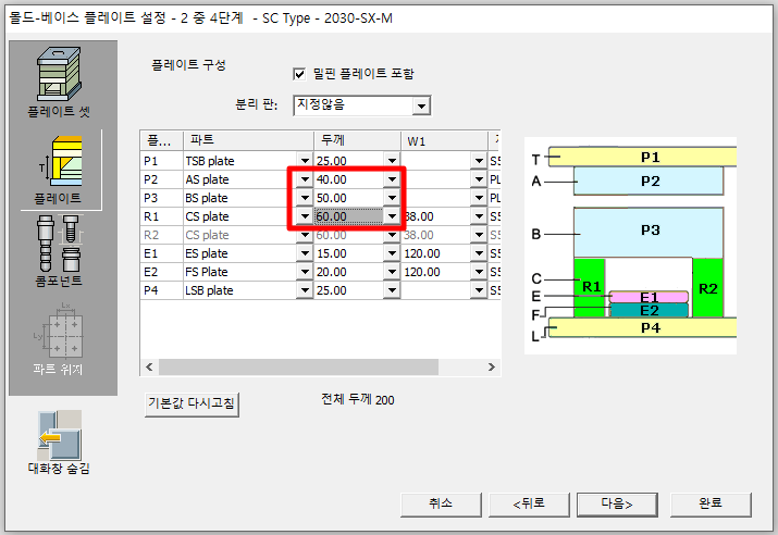 몰드베이스 SC 2030405060 를 만든다고 가정해보겠습니다. SC 타입은 2단금형이죠. 2단 금형중에는 가장 많이 사용되는 타입이 아닐까 생각됩니다. 몰드 설계할일이 없는 분들은 패스해주세요. 몰드 설계를 많이 하시는분들은 알아두시면 좋습니다.