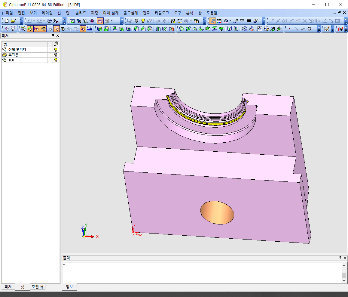 모델링을 확대해 보시면 노란색이 보입니다. 이곳은 가공이 힘든부분이기때문에 전극이 꼭 들어가야 하는 부분입니다. 이 노란색부분에 전극을 생성하도록 하겠습니다.
