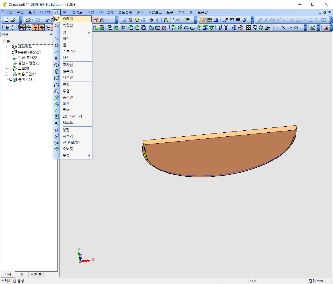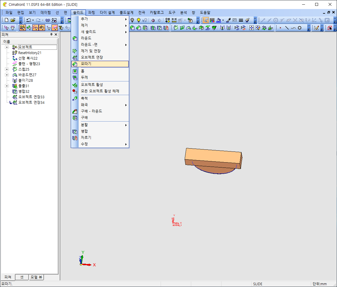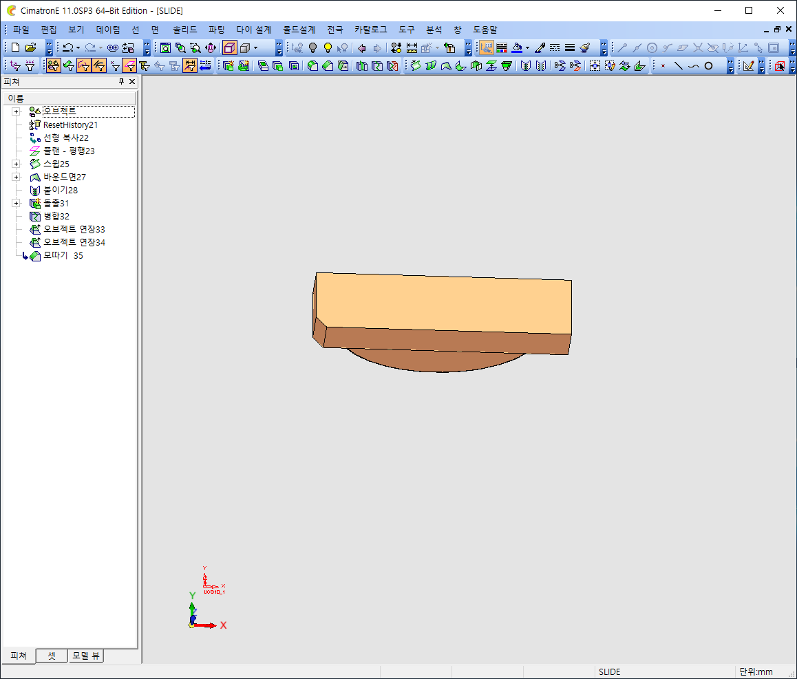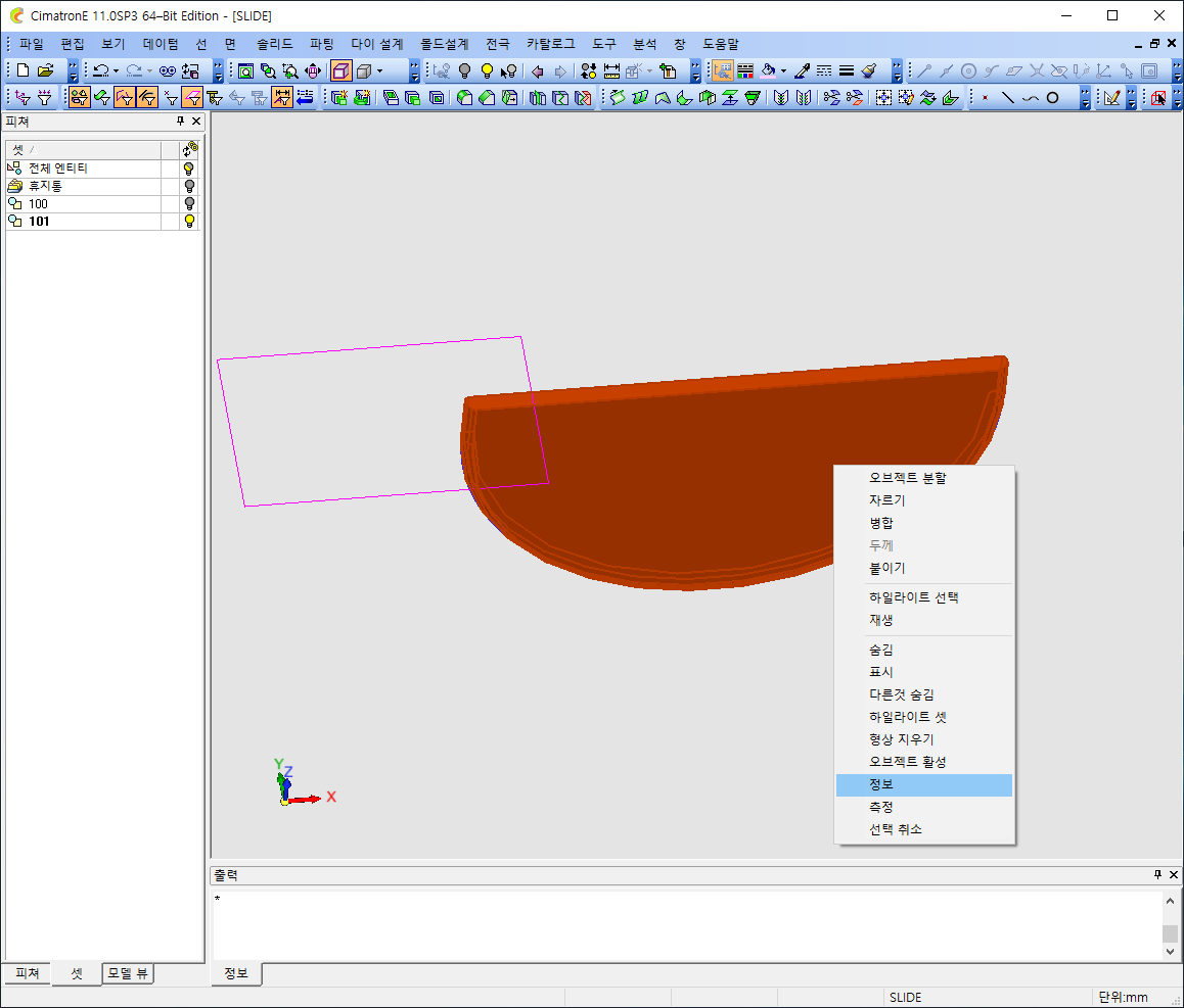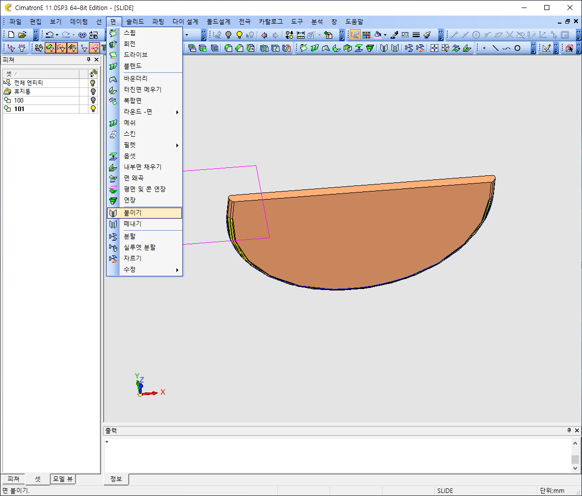 솔리드 >> 병합 을 클릭해서 두개의 덩어리를 하나로 합쳐줍니다.