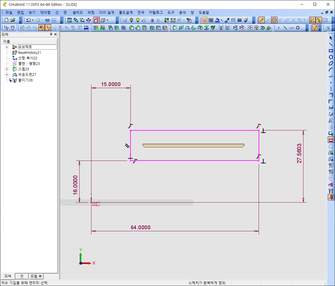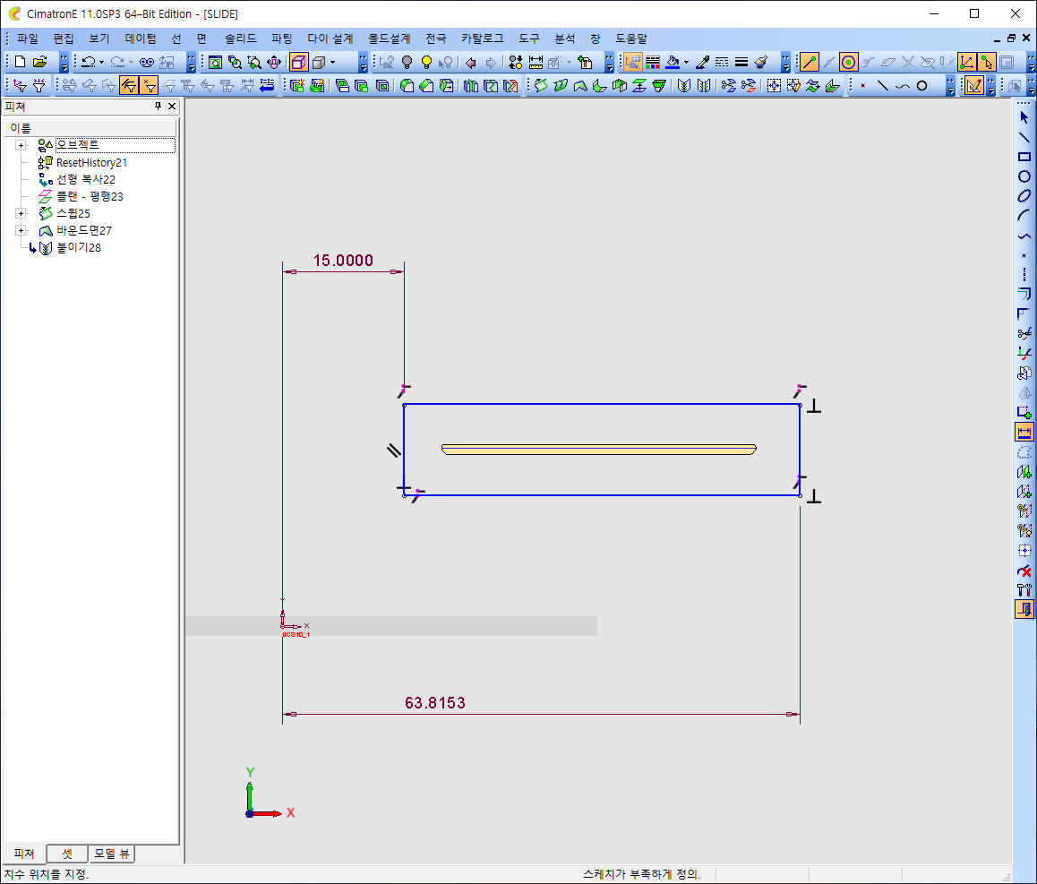 일단 X1 치수부터 확인해봅니다. UCS 에서의 거리가 14.6014 로 나오네요 반올림 해주세요. 15로 수정합니다.