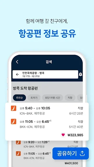 여행 일정과 목적지를 정해 놓으셨나요? 그렇다면, 스마트 필터를 사용하여 비행시간, 항공사, 경유지 수, 좌석 등급, 출발과 도착 시간 을 기준으로 항공권을 검색할 수 있습니다.