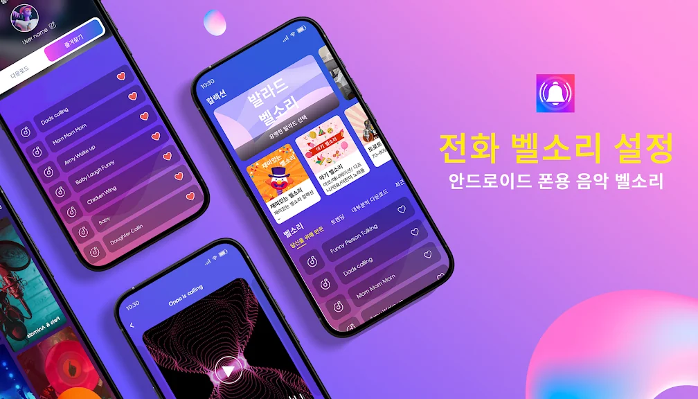 자신의 개성에 맞게 핸드폰을 꾸미는 것이 정말 쉬워졌습니다. 벨소리 Android™ 전용 앱을 다운로드하고, 휴대폰 알림음을 위한 벨소리를 선택하고, 연락처 알림음을 위해 멋진 벨소리 어플을 활용해보세요.이 벨소리 다운 앱을 이용하면, 1000개 이상의 벨소리와 1000개 이상의 배경화면을 사용할 수 있고, 이 벨소리 및 배경화면 어플은 당신의 취향에 맞는 모든 것을 갖고 있습니다. 이 벨소리를 수신음, 문자 알림음, 알림음으로 설정할 수 있으며, 벨소리 Android™ 전용 앱으로 무궁 무진한 것을 할 수 있습니다! 휴대폰 배경화면을 주기적으로 변경해보세요. 배경화면 섹션에서 다양한 휴대폰 배경화면을 고를 수 있습니다.