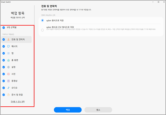 ③ 전화 및 연락처(spbm, 또는 spbm 형식과 csv 형식으로 저장 중 선택) 형식 선택→ 백업
