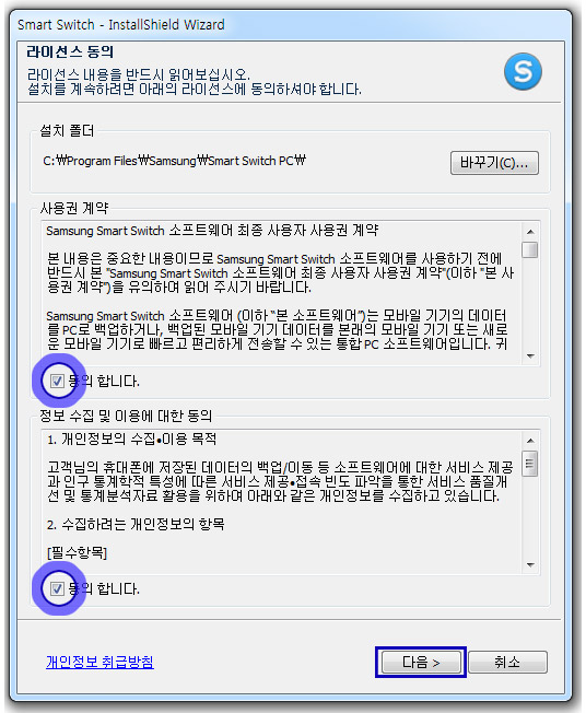설치가 진행됩니다. 사용권 계약과 정보수집 및 이용에 대한 동의 후 [다음]을 선택합니다.