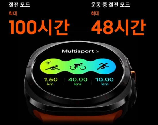 갤럭시 워치7 울트라는 절전 모드를 활용하면 최대 100시간까지 사용이 가능합니다. 운동 중 절전 모드를 사용할 경우 최대 48시간까지 사용할 수 있어 장시간 사용에도 걱정 없이 이용할 수 있습니다.