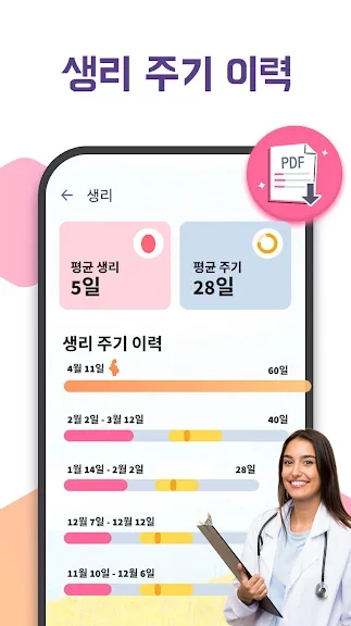 이 앱은 Google 계정 백업을 지원해 데이터를 안전하게 보관하고, 자동 백업 기능으로 중요한 정보를 잃지 않도록 관리할 수 있습니다. 또한, 체중, 체온, 기분, 몸 상태 등을 기록하여 생리주기와 건강 상태를 정확하게 추적할 수 있습니다.