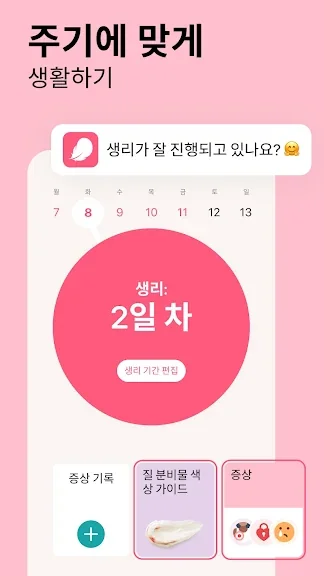 이 앱은 파트너와 정보를 공유하고 관계를 강화할 수 있는 기능도 제공하며, 알림 설정으로 중요한 생리 날짜와 배란, 피임약 복용 등을 관리할 수 있습니다. 건강 도우미와의 채팅을 통해 생리 지연, 불규칙한 주기 등 다양한 건강 문제에 대해 도움을 받을 수 있습니다.