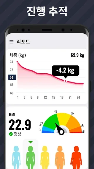 운동은 애니메이션과 동영상 가이드를 통해 정확한 자세로 진행할 수 있어, 장비 없이 언제 어디서든 쉽게 따라 할 수 있습니다. 운동 강도는 점차적으로 증가하여, 3일마다 휴식을 취하며 몸이 점진적으로 적응할 수 있도록 돕습니다. 체중 감량 진행 상황과 칼로리 소모량은 그래프를 통해 시각적으로 확인할 수 있습니다.