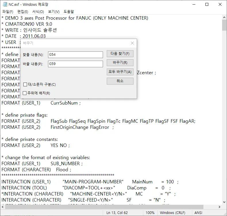 예를들어 G54 를 G59 로 출력되도록 수정하는 작업을 하도록 하겠습니다.